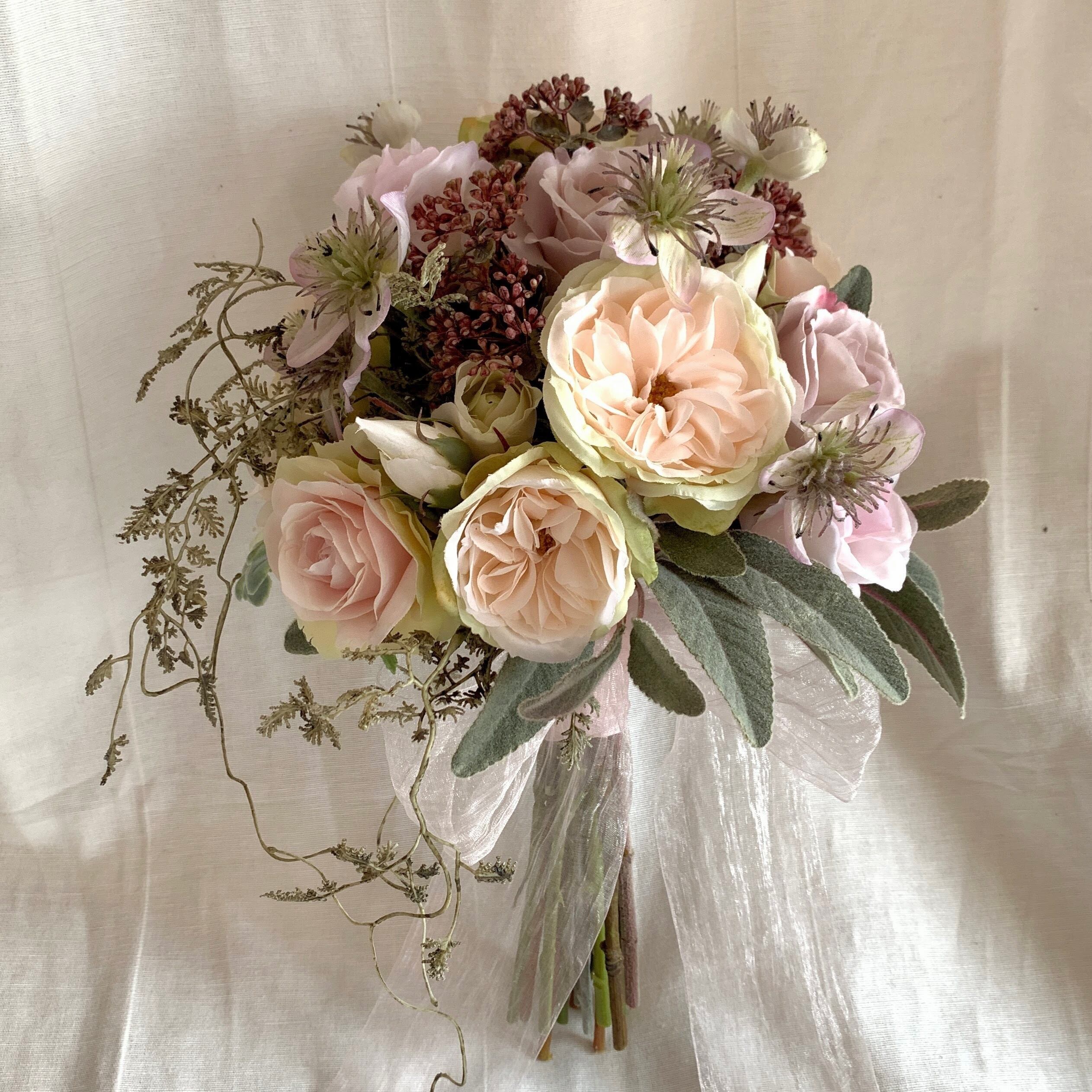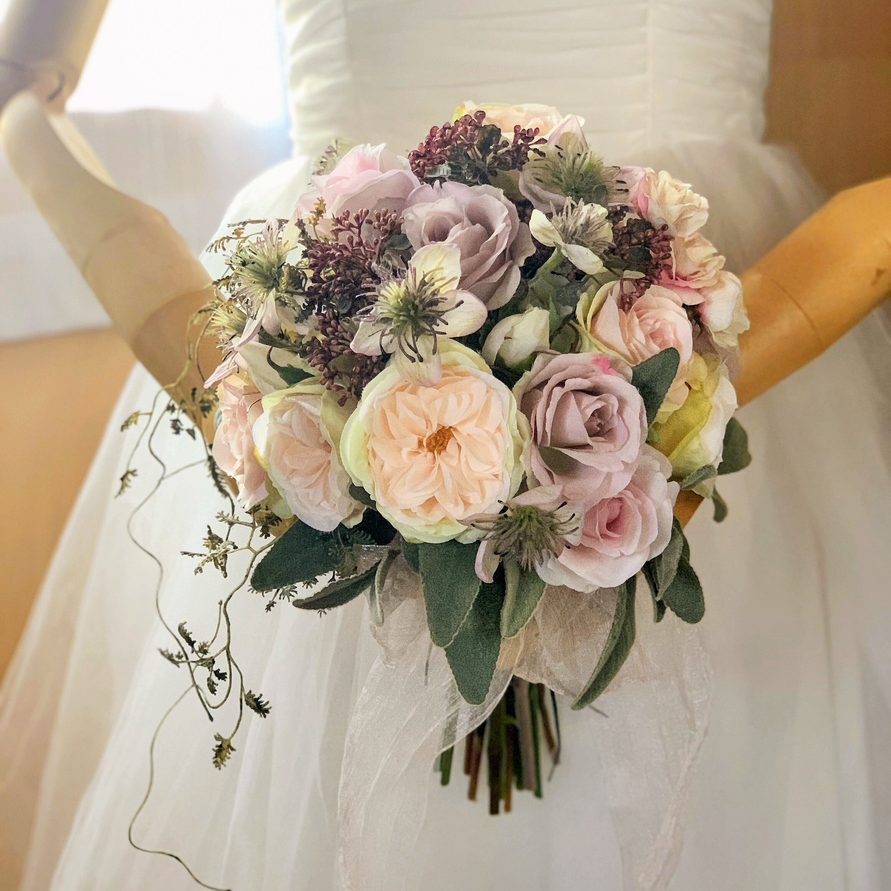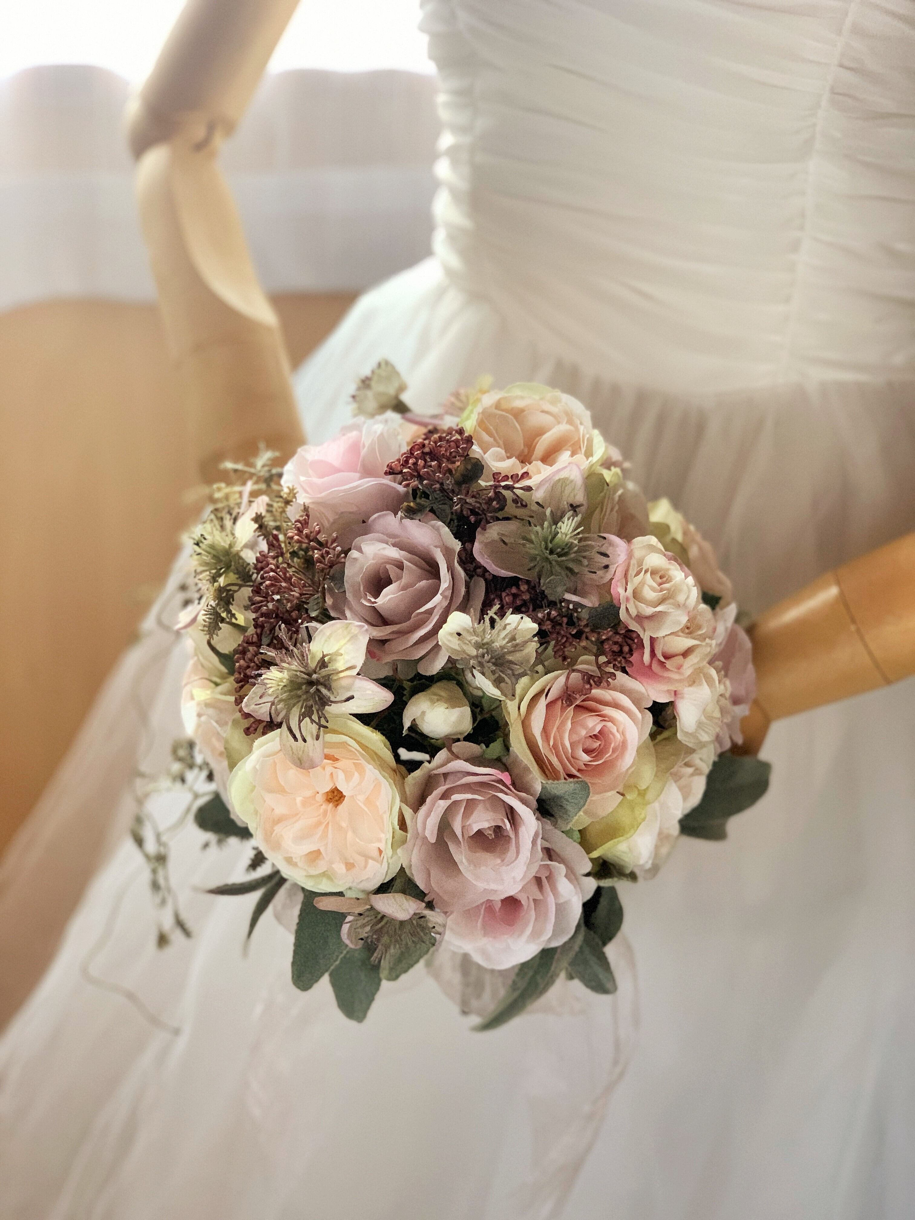 クラシカルな淡いピンクのオープンローズをメインにした、シックシャビーな色合いのラウンドブーケです